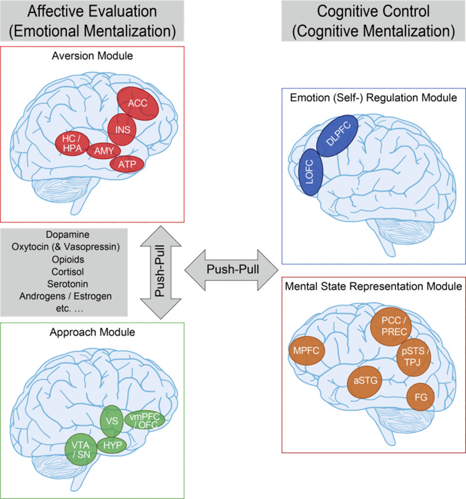 Similar findings emerged from another study [15] that looked at mothers’ brain responses to infant videos as a function whether mothers’ caregiving styles were more or less attuned and intrusive. Mothers with a more attuned caregiving style showed higher activation in reward-related areas (i.e., our ‘approach module’) and better information exchange with areas part of our ‘emotion regulation’ and ‘mental state representation’ modules. Conversely, mothers with a more intrusive caregiving style showed higher activity in the amygdala (i.e., part of our ‘aversion module’) and less coordinated information exchange with the other neural modules.
